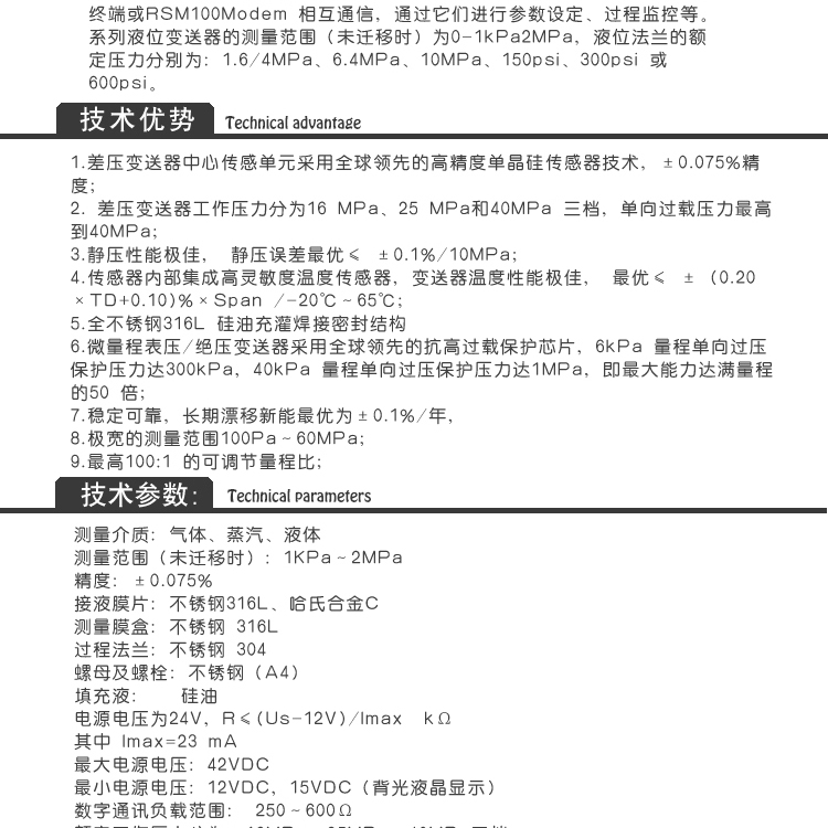 微量程表壓/絕壓變送器采用全球領(lǐng)先的抗高過(guò)載保護(hù)芯片,6kPa 量程單向過(guò)壓保護(hù)壓力達(dá)300kPa,40kPa 量程單向過(guò)壓保護(hù)壓力達(dá)1MPa,即****能力達(dá)滿(mǎn)量程的50 倍,穩(wěn)定可靠,長(zhǎng)期漂移新能最優(yōu)為±0.1%/年,極寬的測(cè)量范圍100Pa~60MPa,最高100:1 的可調(diào)節(jié)量程比