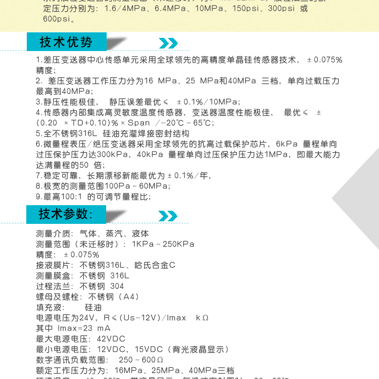 全不銹鋼316L 硅油充灌焊接密封結構,傳感器內(nèi)部集成高靈敏度溫度傳感器,變送器溫度性能****,靜壓性能****, 靜壓誤差******≤ ±0.1%/10MPa。