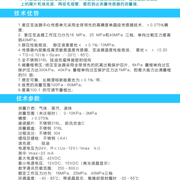 微量程表壓/絕壓變送器采用全球領(lǐng)先的抗高過載保護(hù)芯片,6kPa 量程單向過壓保護(hù)壓力達(dá)300kPa,40kPa 量程單向過壓保護(hù)壓力達(dá)1MPa,能力達(dá)滿量程的50 倍,穩(wěn)定可靠,長期漂移新能最優(yōu)為±0.1%/年,極寬的測量范圍100Pa~60MPa,最高100:1 的可調(diào)節(jié)量程比。